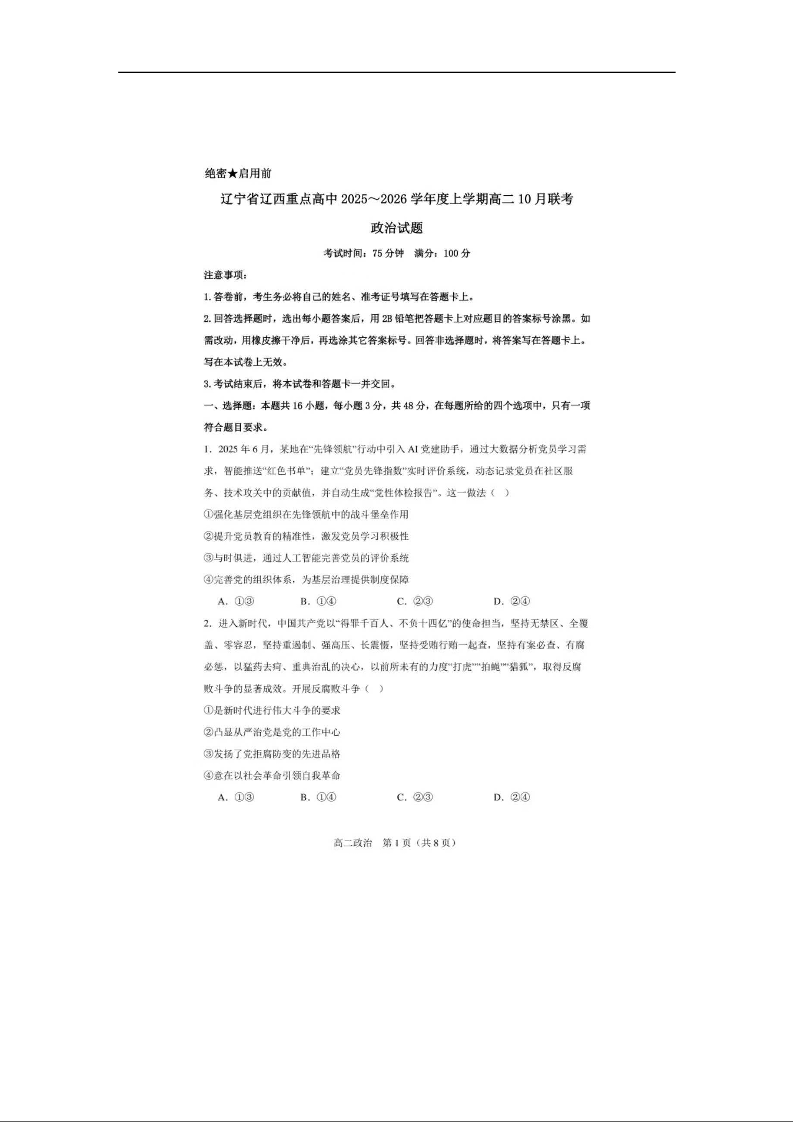高二政治--辽西重点高中2025-2026学年高二上学期10月月考