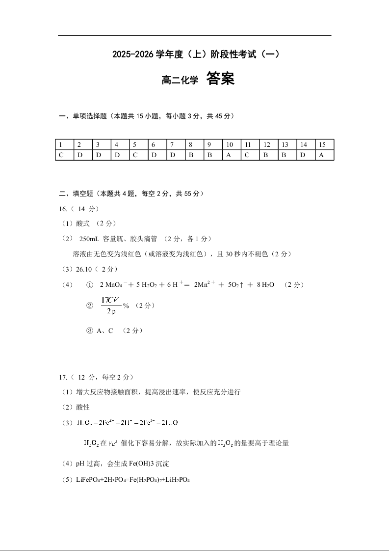 高二化学答案--四川省成都市成华区某校2025-2026学年高二上学期阶段性考试(一)