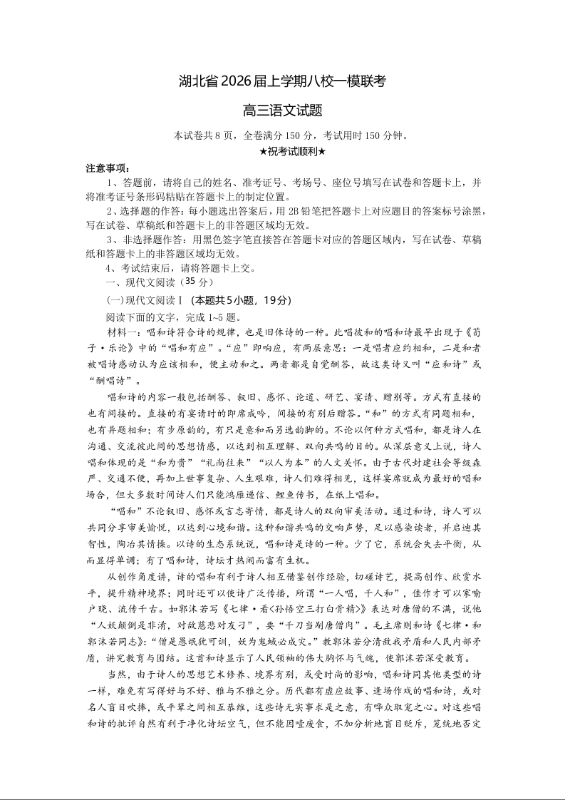 高三语文(原卷版)--湖北省八校2026届高三上学期一模考试
