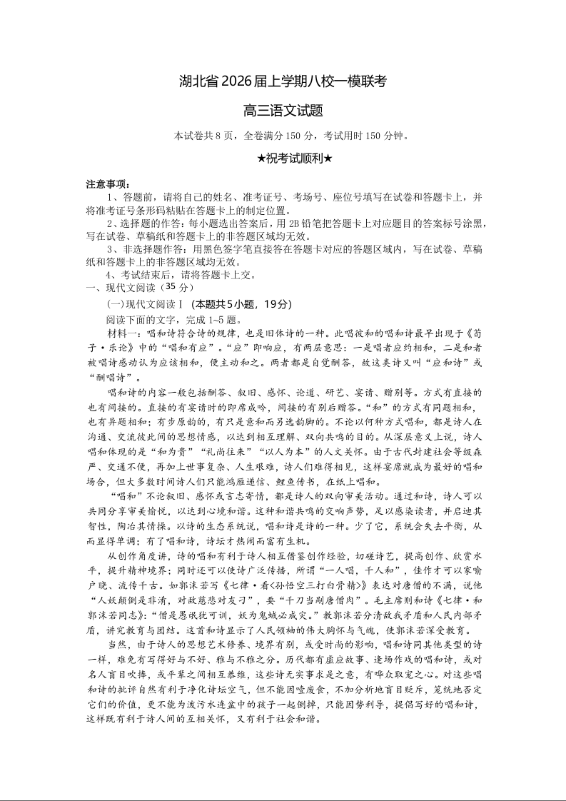 高三语文(精品解析版)--湖北省八校2026届高三上学期一模考试