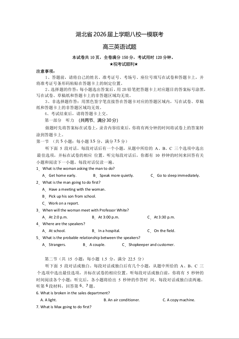 高三英语(原卷版)--湖北省八校2026届高三上学期一模考试