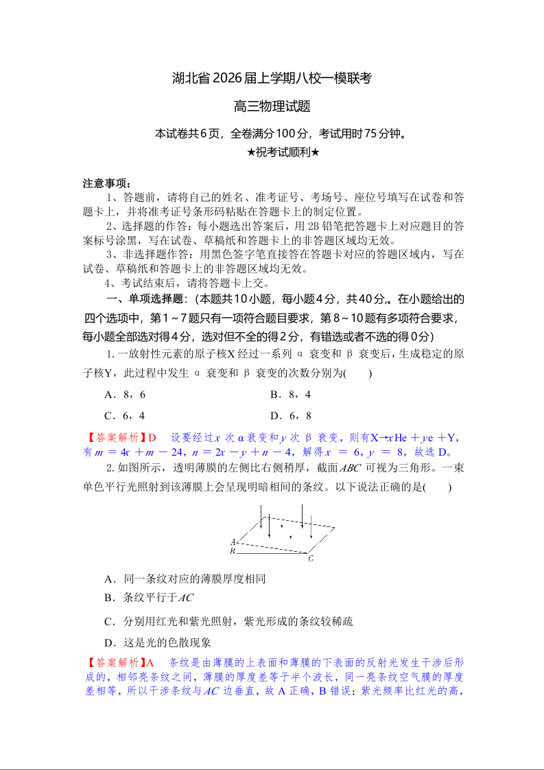 高三物理(精品解析版)--湖北省八校2026届高三上学期一模考试