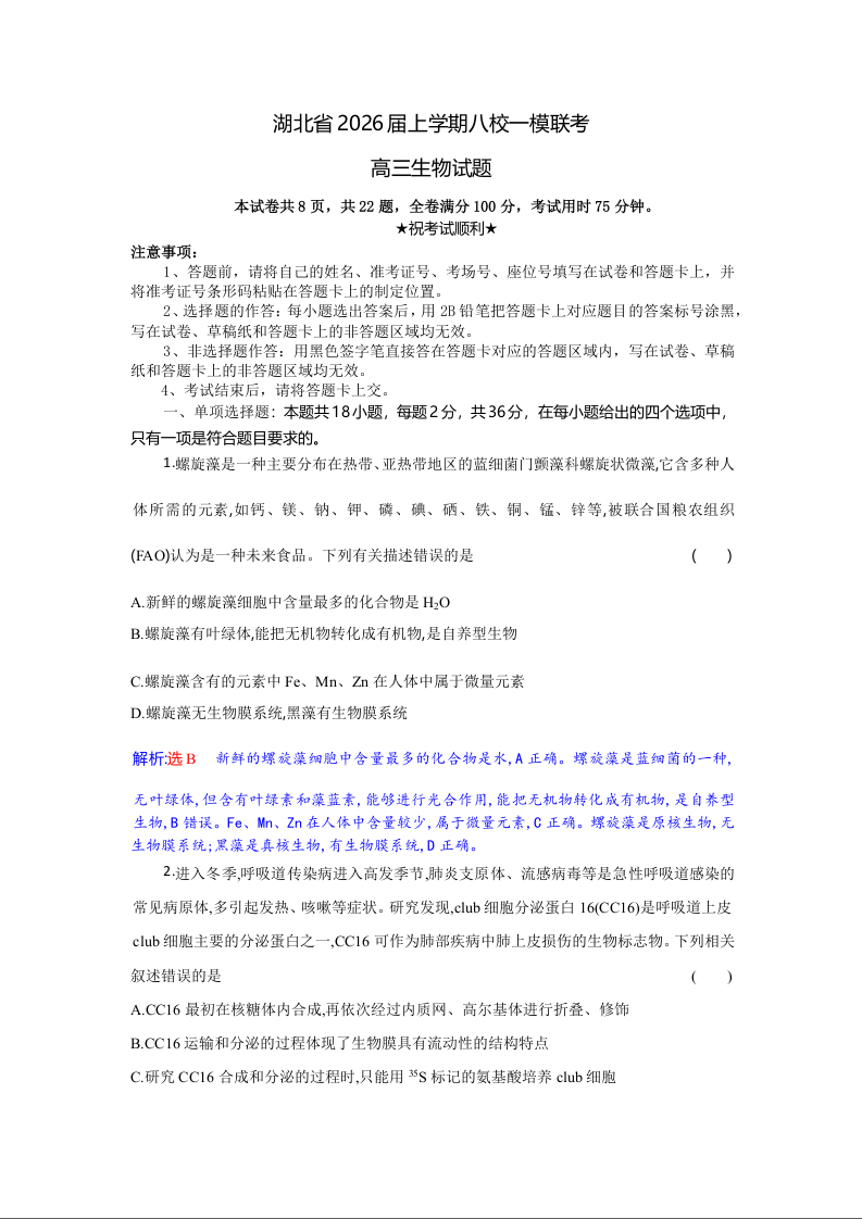 高三生物(精品解析版)--湖北省八校2026届高三上学期一模考试