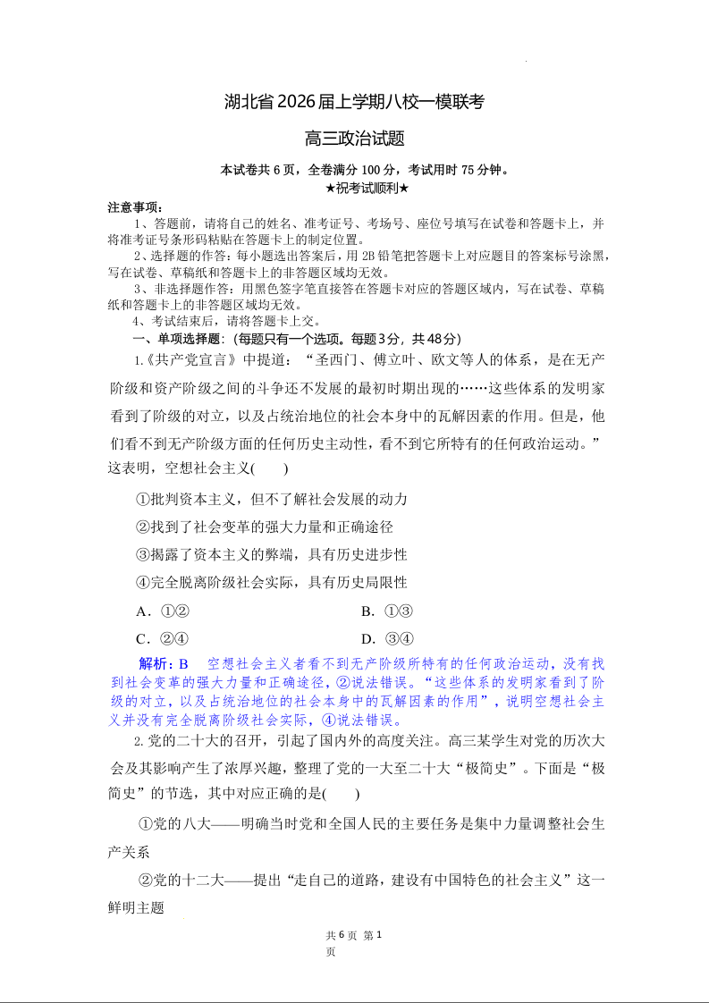 高三政治(精品解析版)--湖北省八校2026届高三上学期一模考试