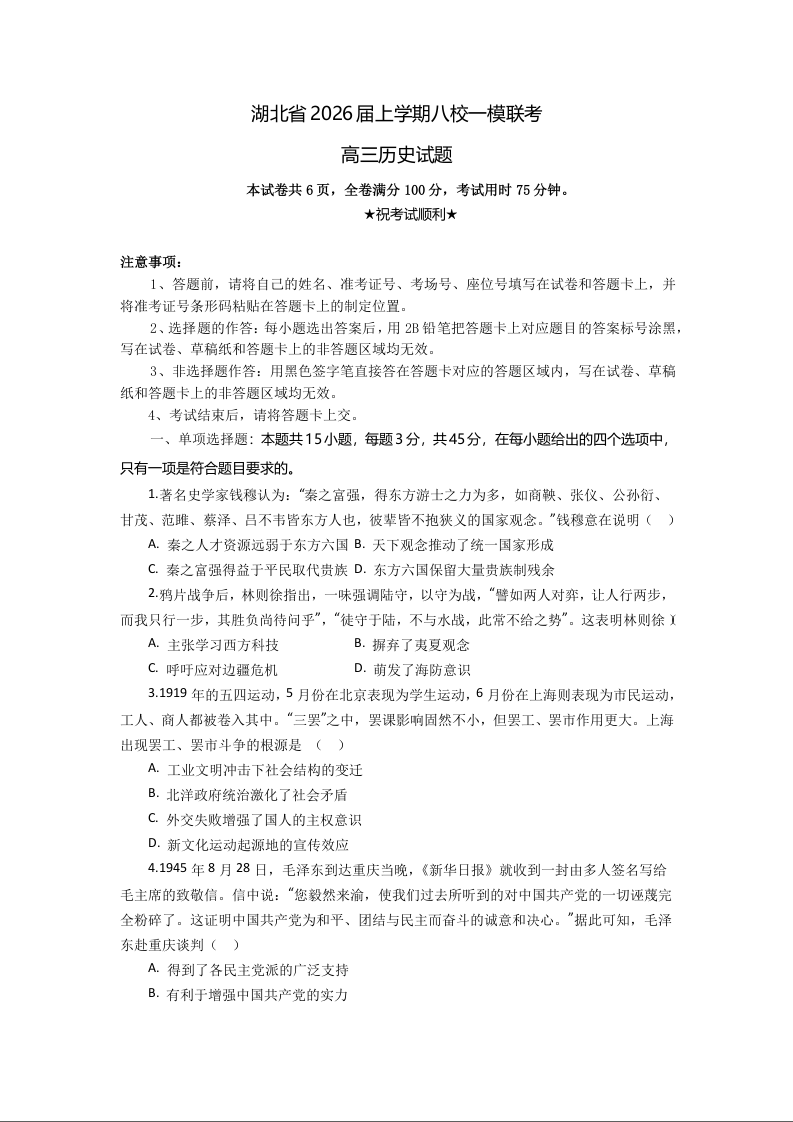 高三历史(原卷版)--湖北省八校2026届高三上学期一模考试