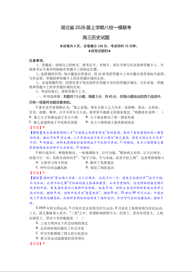 高三历史(精品解析版)--湖北省八校2026届高三上学期一模考试
