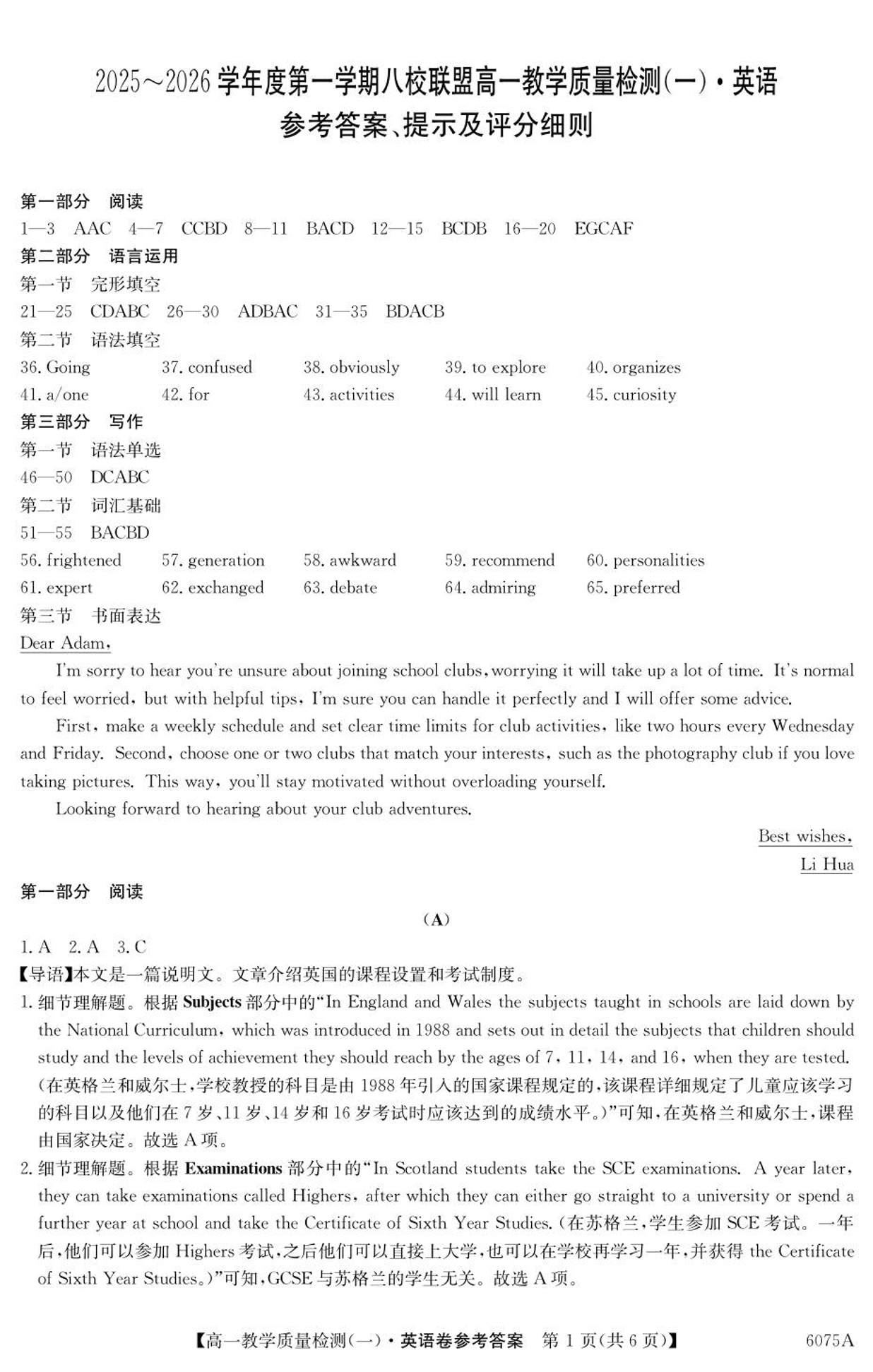 高一英语答案--广东省八校联盟2025-2026学年高一上学期教学质量检测(一)