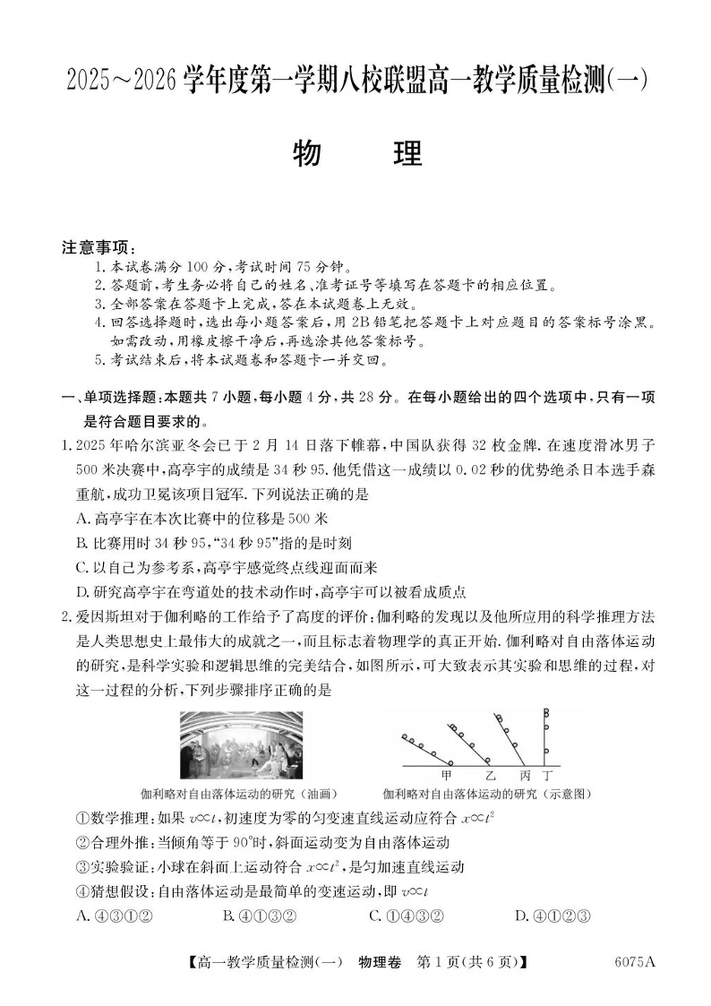 高一物理+答案--广东省八校联盟2025-2026学年高一上学期教学质量检测(一)