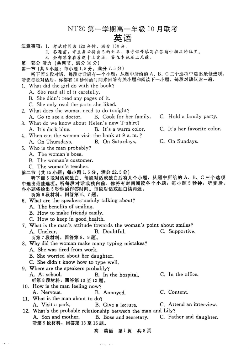 高三英语+答案--河北省NT20名校联合体2025-2026学年高一上学期10月联考