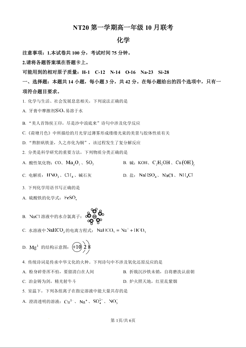 高三化学(原卷版)--河北省NT20名校联合体2025-2026学年高一上学期10月联考