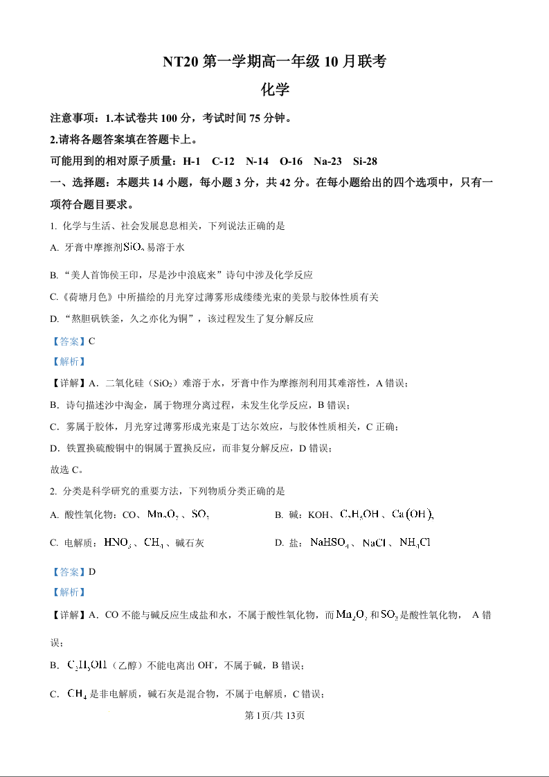 高三化学(精品解析版)--河北省NT20名校联合体2025-2026学年高一上学期10月联考
