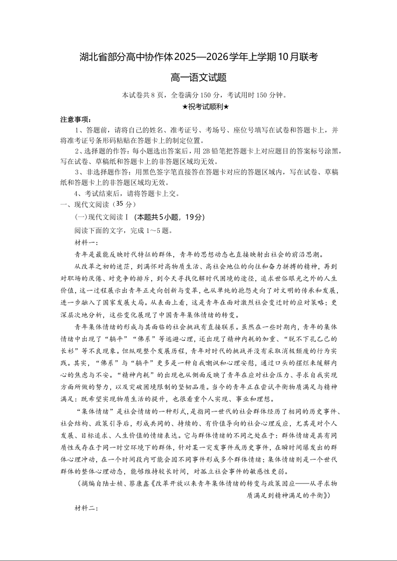 高一语文(原卷版)--湖北省部分高中协作体2025-2026学年高一上学期10月月考