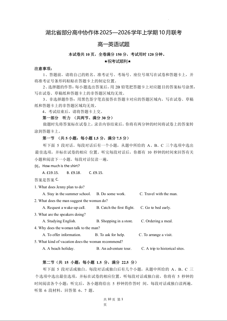 高一英语--湖北省部分高中协作体2025-2026学年高一上学期10月月考