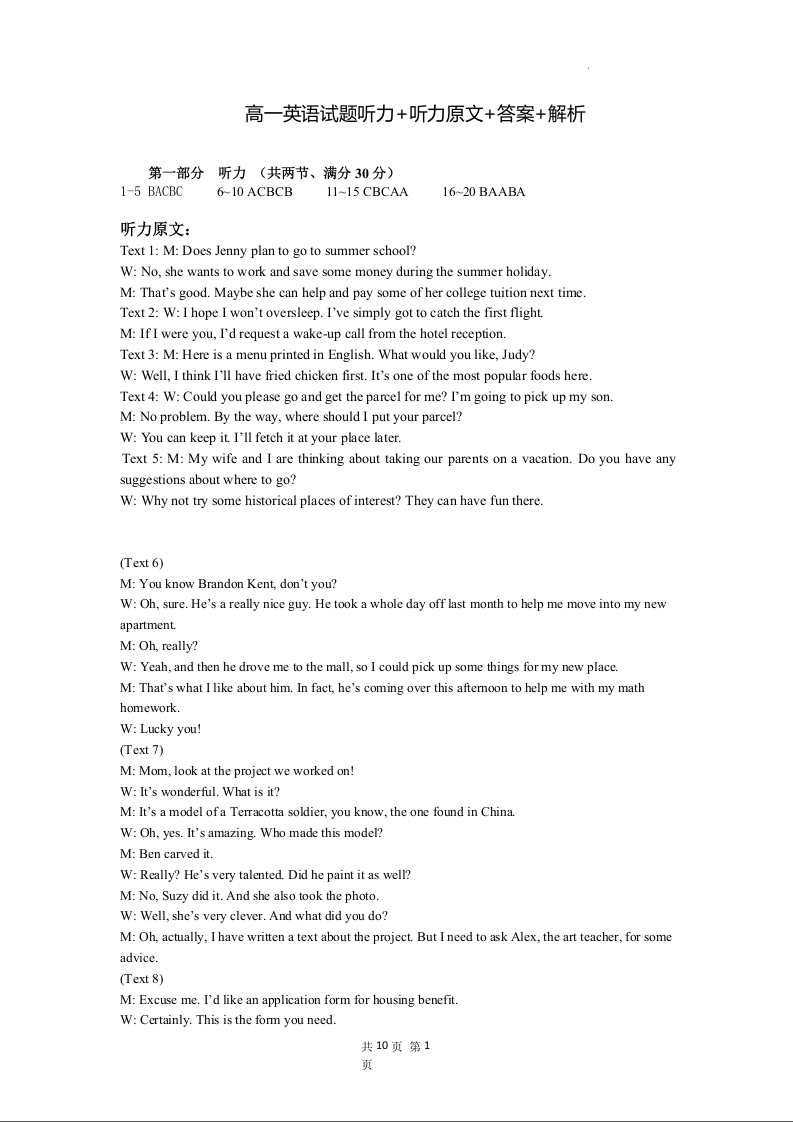 高一英语答案--湖北省部分高中协作体2025-2026学年高一上学期10月月考