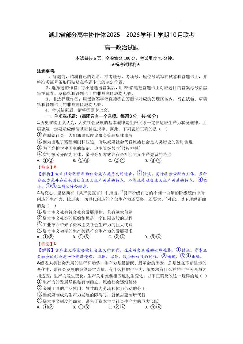 高一政治(精品解析版)--湖北省部分高中协作体2025-2026学年高一上学期10月月考