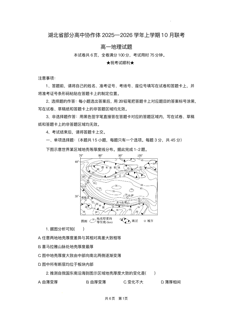 高一地理+答案--湖北省部分高中协作体2025-2026学年高一上学期10月月考