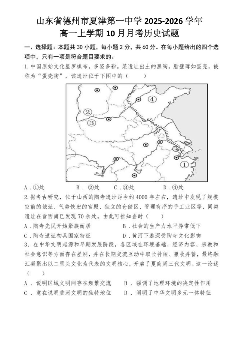 高一历史--山东省德州市夏津第一中学2025-2026学年高一上学期10月月考