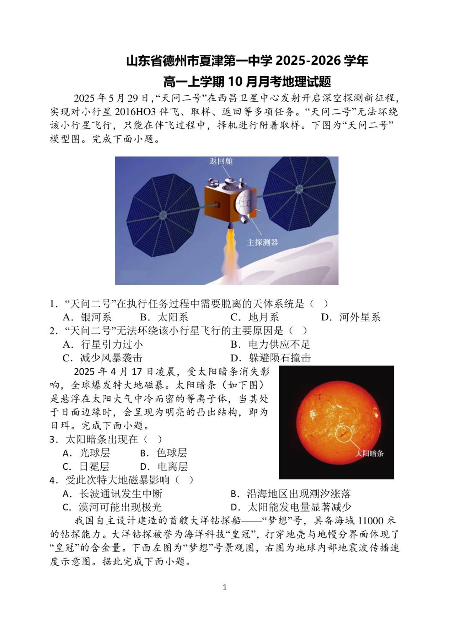 高一地理--山东省德州市夏津第一中学2025-2026学年高一上学期10月月考