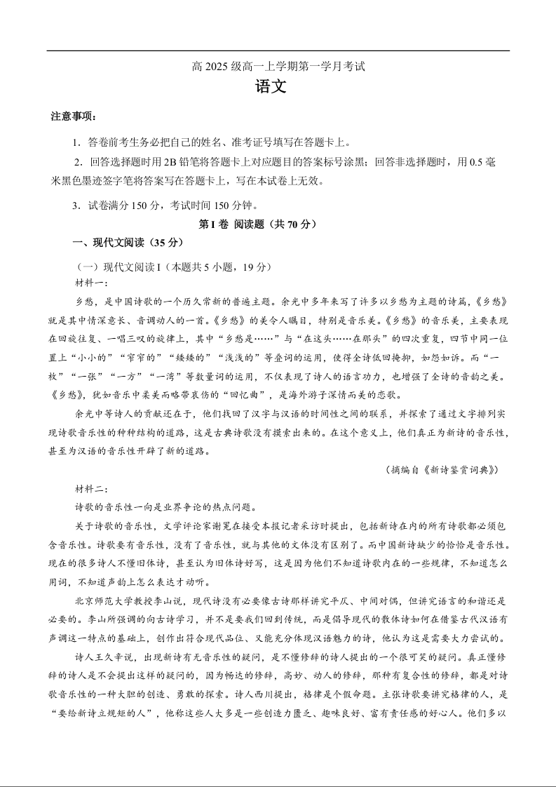 高一语文--四川省泸州市泸县第五中学2025-2026学年高一上学期10月月考