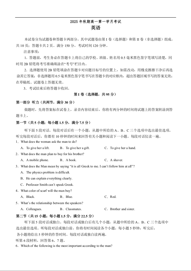 高一英语--四川省泸州市泸县第五中学2025-2026学年高一上学期10月月考