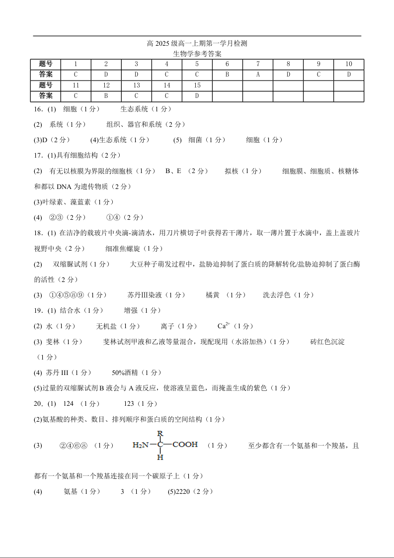 高一生物答案--四川省泸州市泸县第五中学2025-2026学年高一上学期10月月考