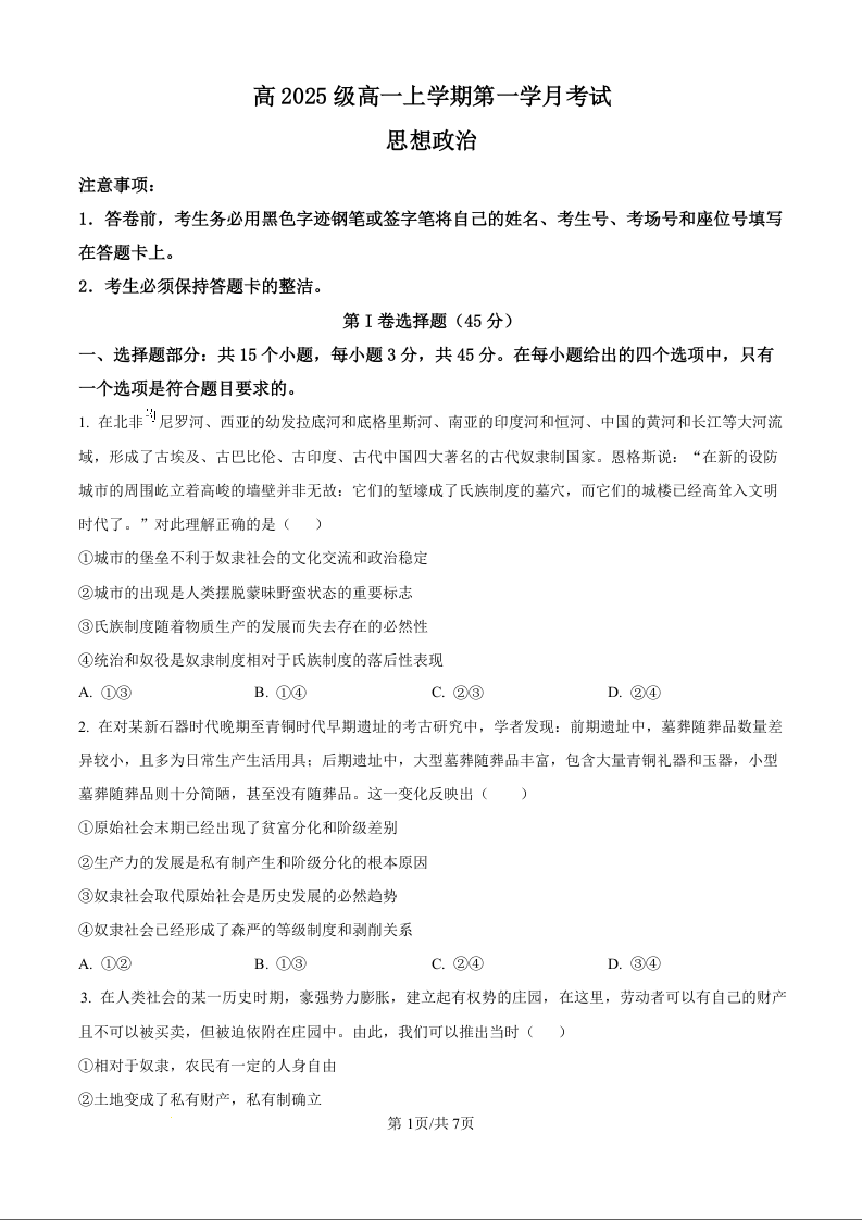 高一政治(原卷版)--四川省泸州市泸县第五中学2025-2026学年高一上学期10月月考
