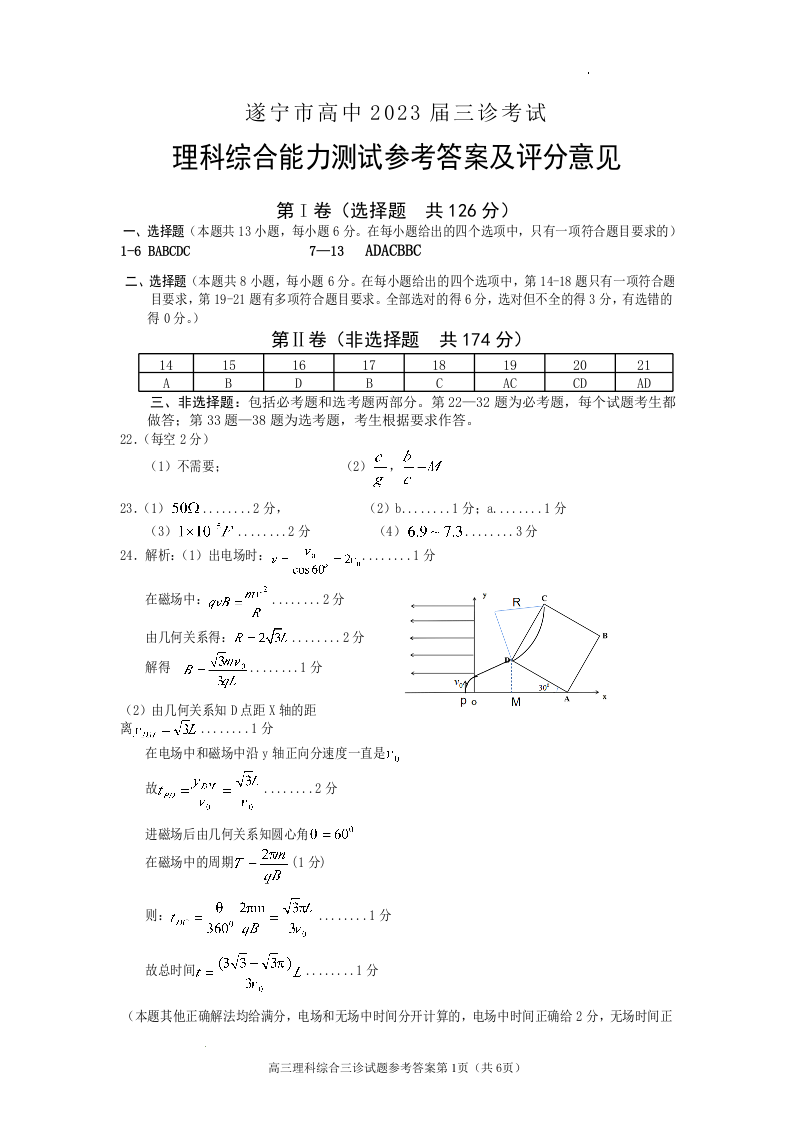 高三理综答案--四川省遂宁市2023届高三下学期三模