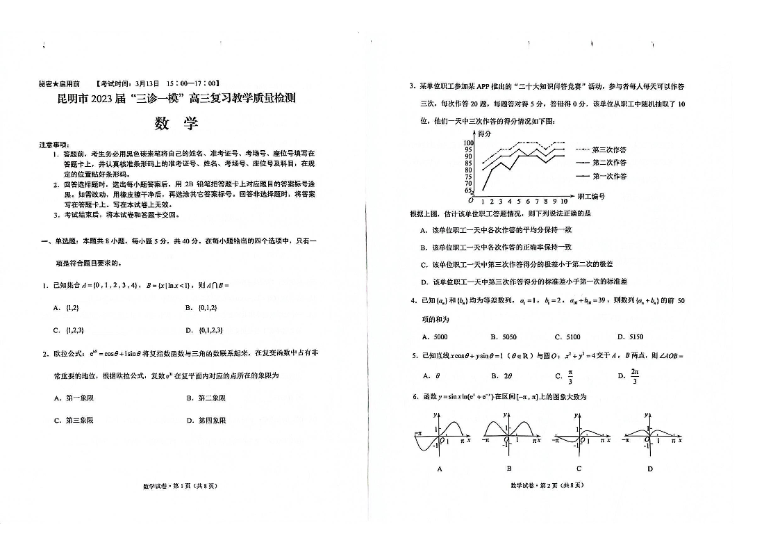 高三数学--云南省昆明市2023届高三“三诊一模”