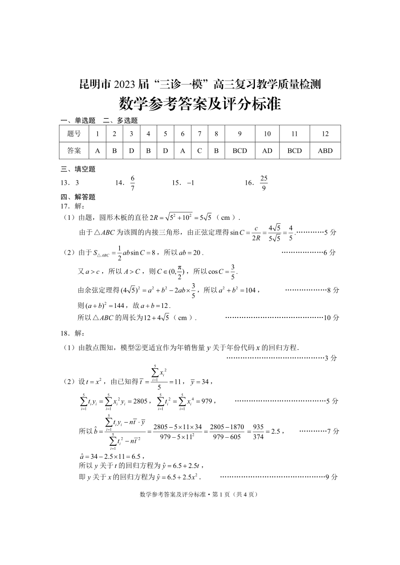 高三数学答案--云南省昆明市2023届高三“三诊一模”
