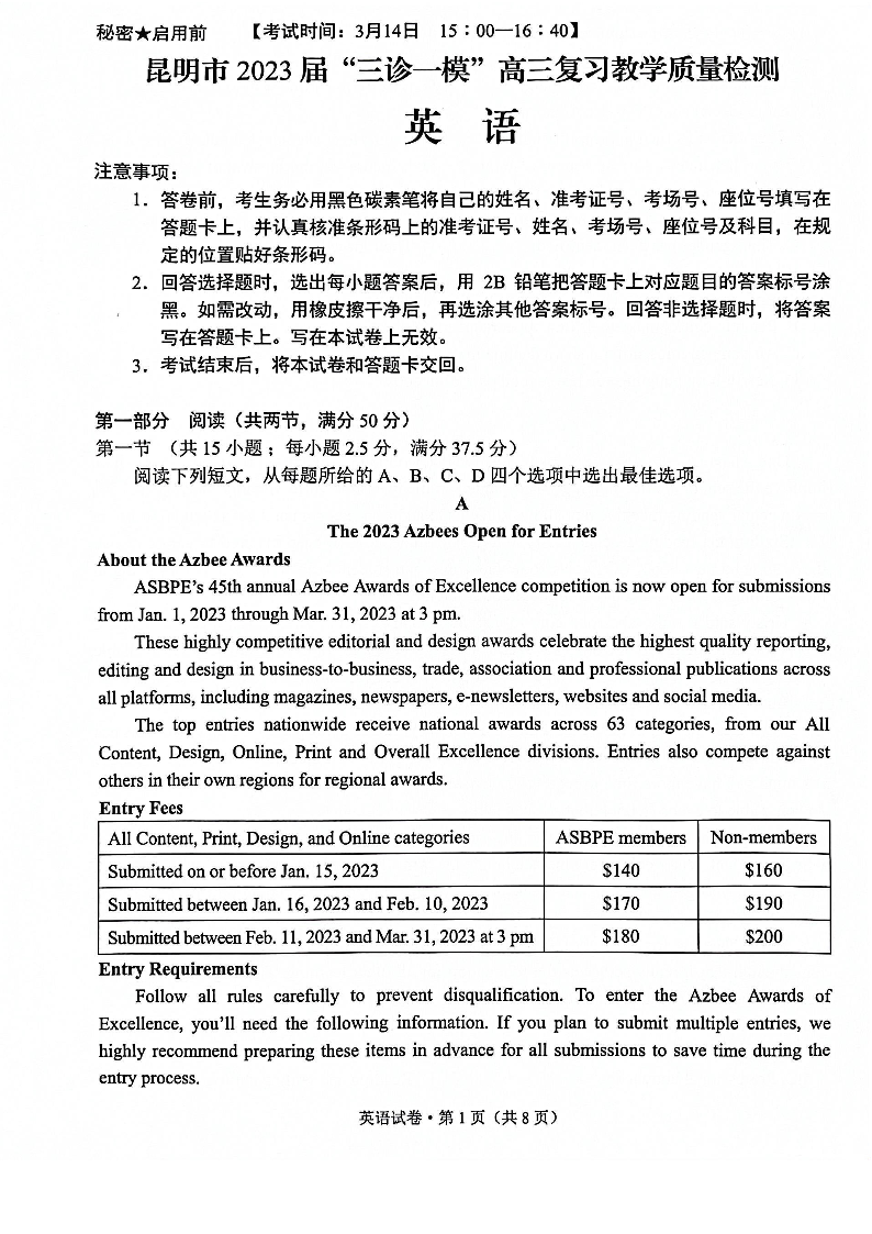 高三英语--云南省昆明市2023届高三“三诊一模”