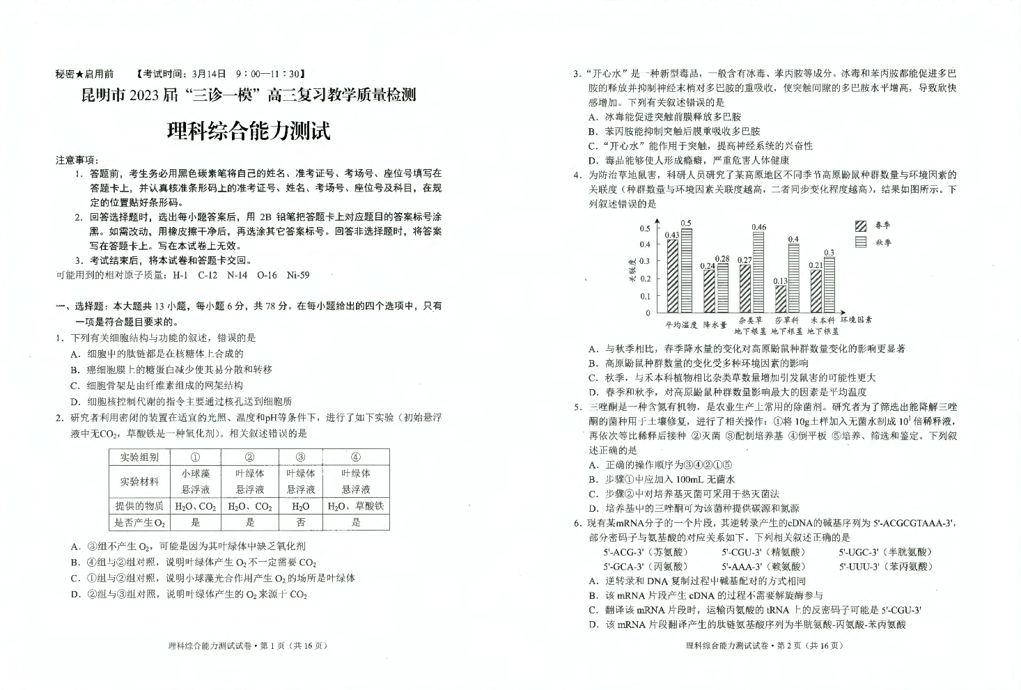 高三理综--云南省昆明市2023届高三“三诊一模”