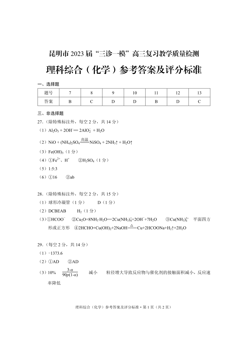 高三理综化学答案--云南省昆明市2023届高三“三诊一模”