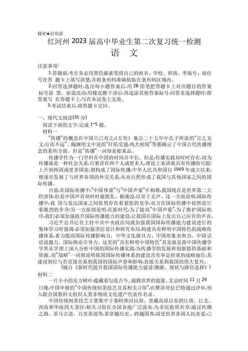 高三语文--云南省红河州 2023 届高中生业生第二次复习统一检测