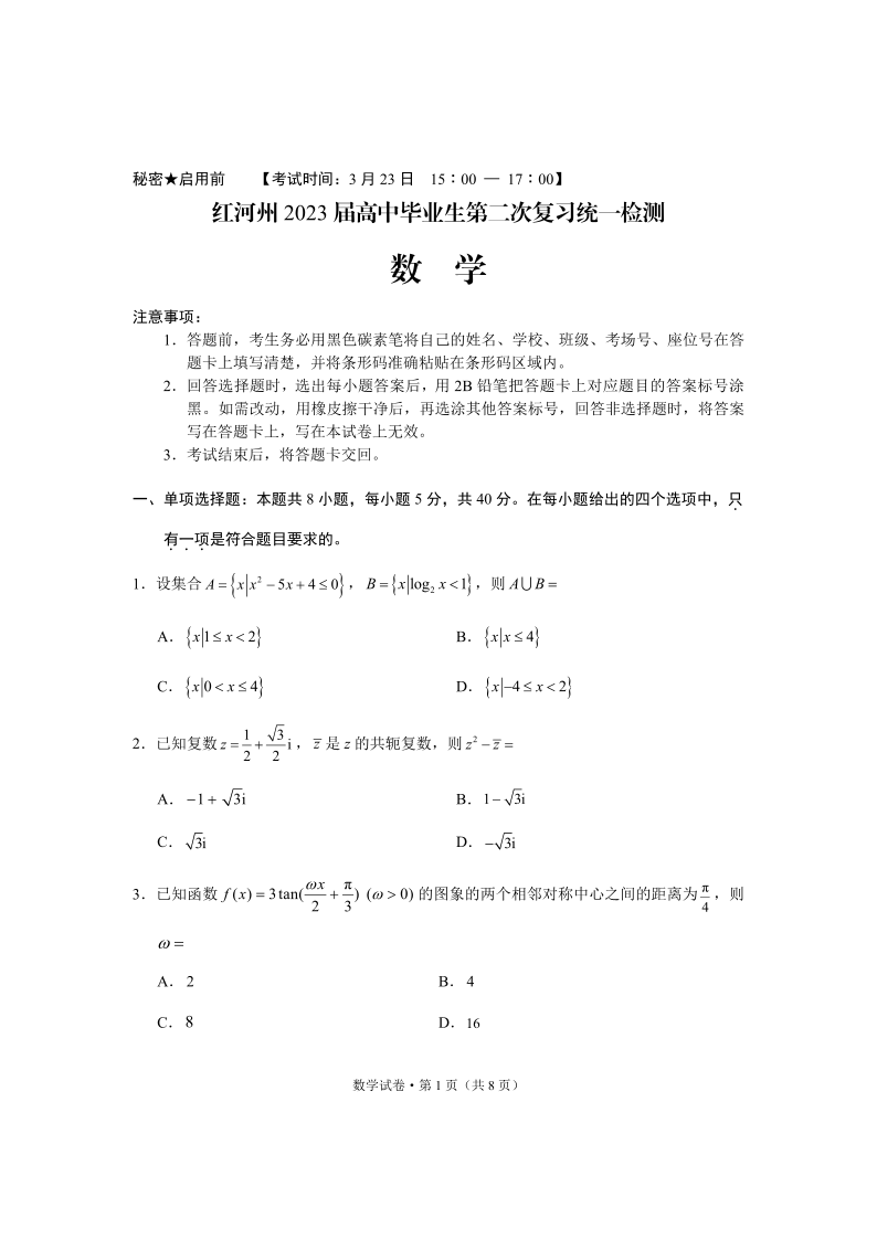高三数学--云南省红河州 2023 届高中生业生第二次复习统一检测