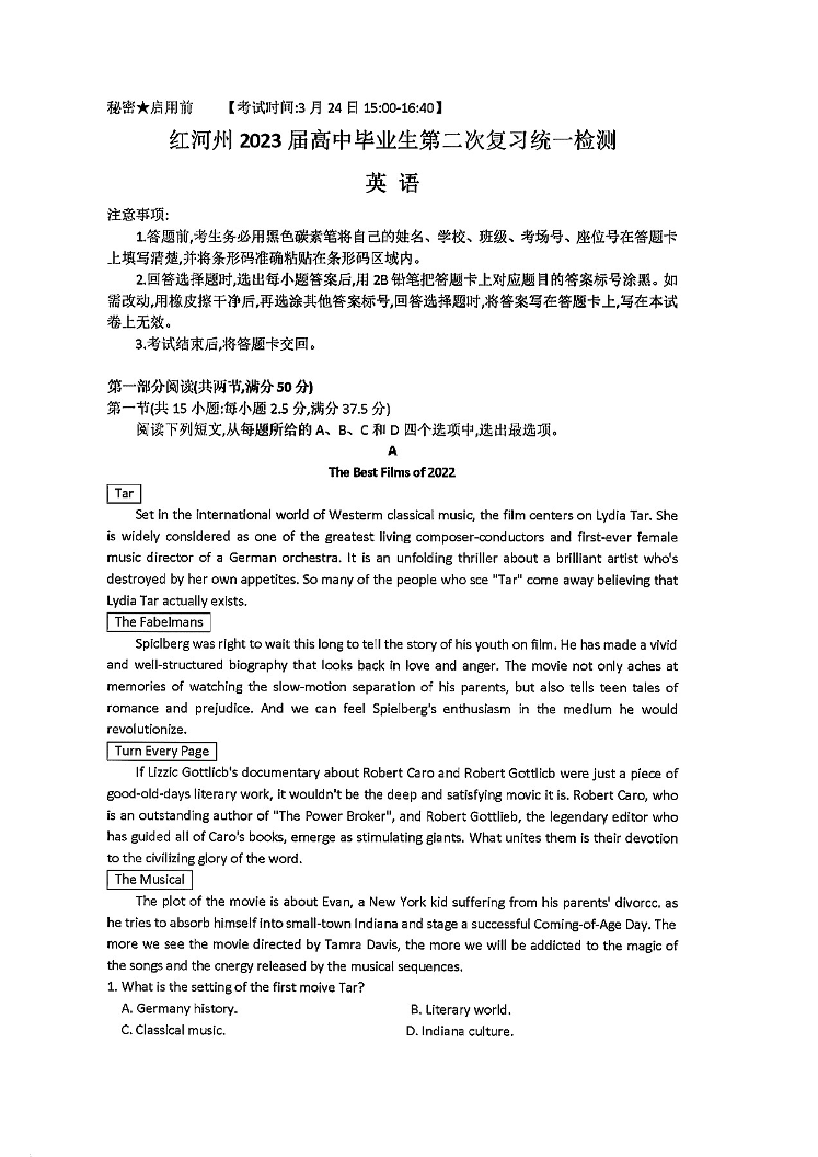 高三英语--云南省红河州 2023 届高中生业生第二次复习统一检测