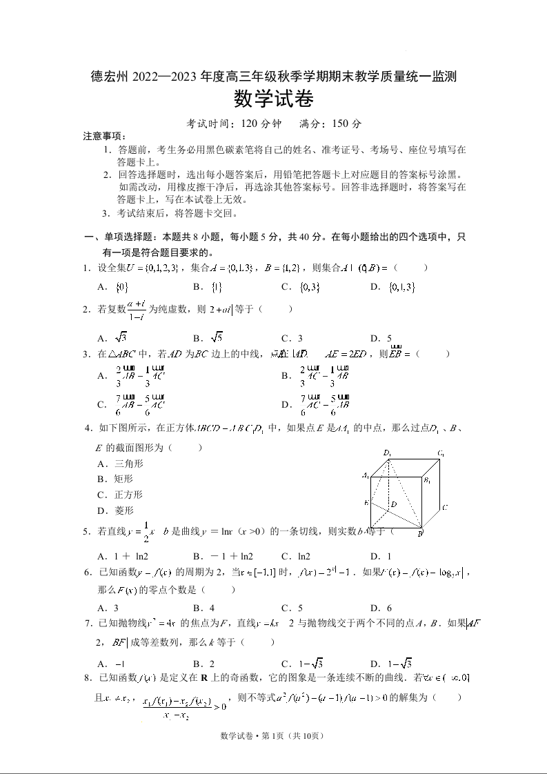 高三数学+答案--云南省德宏州2023届高三上学期期末教学质量统一监测
