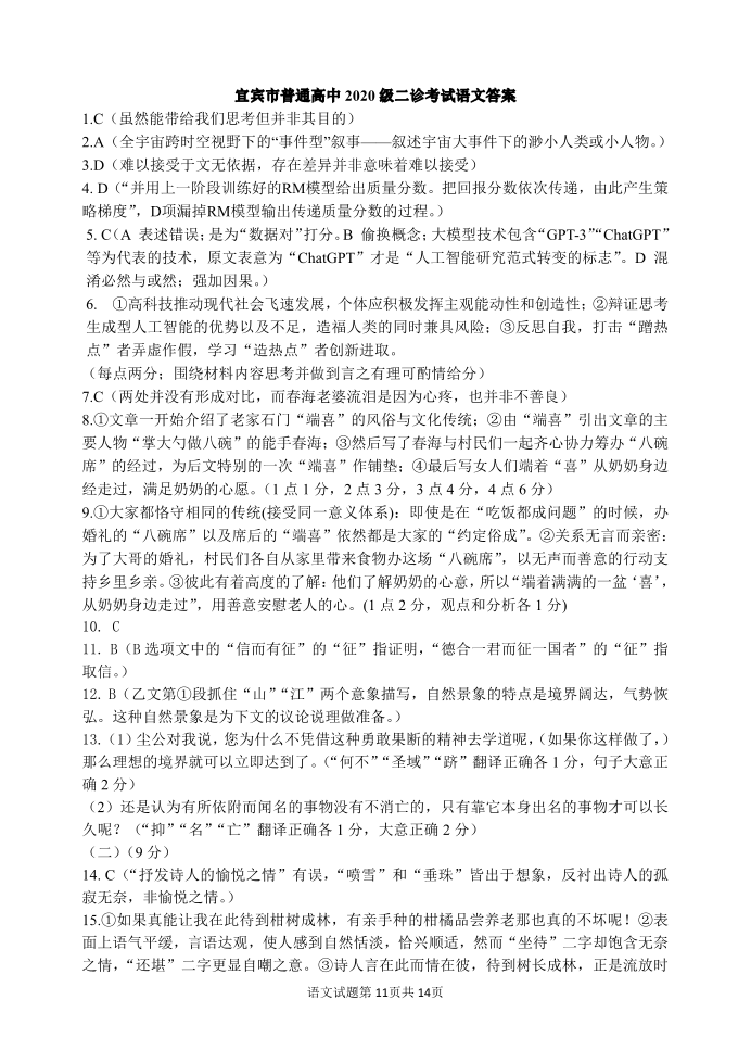 高三语文答案--四川省宜宾市2023届高三下学期(二诊)