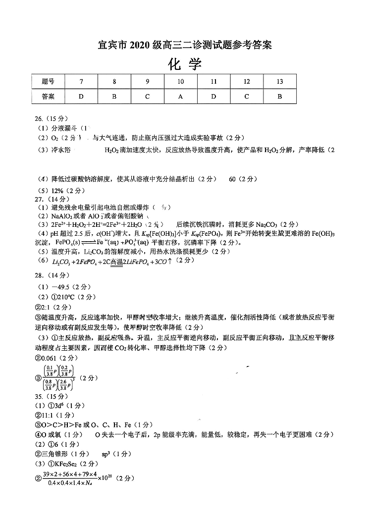高三理综化学,生物答案--四川省宜宾市2023届高三下学期(二诊)