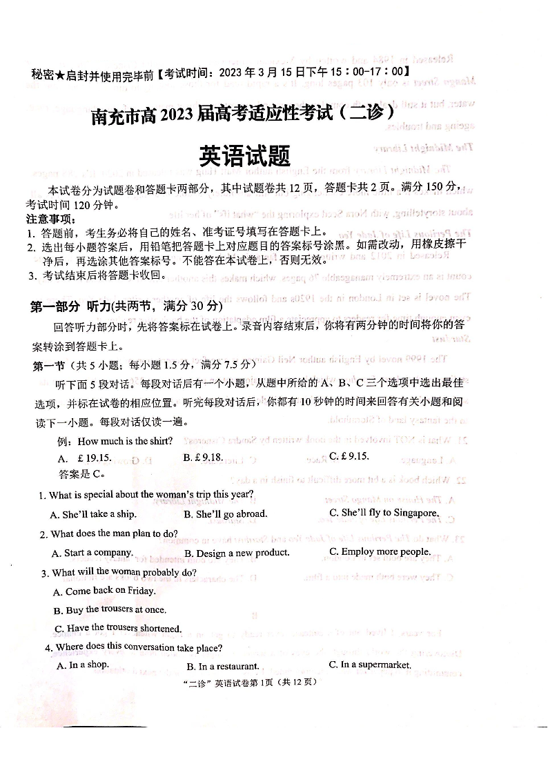 高三英语--四川省南充市2023届高三下学期高考适应性考试(南充二诊)