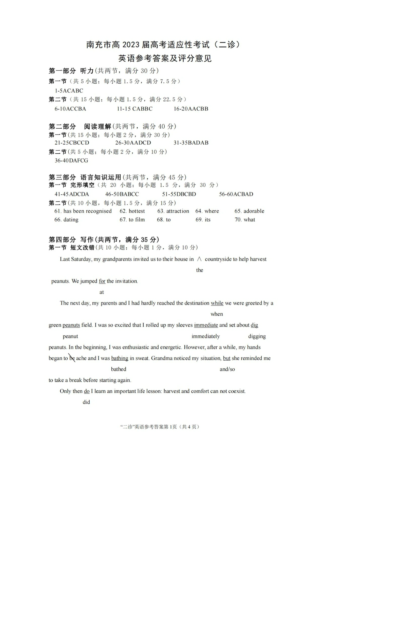 高三英语答案--四川省南充市2023届高三下学期高考适应性考试(南充二诊)
