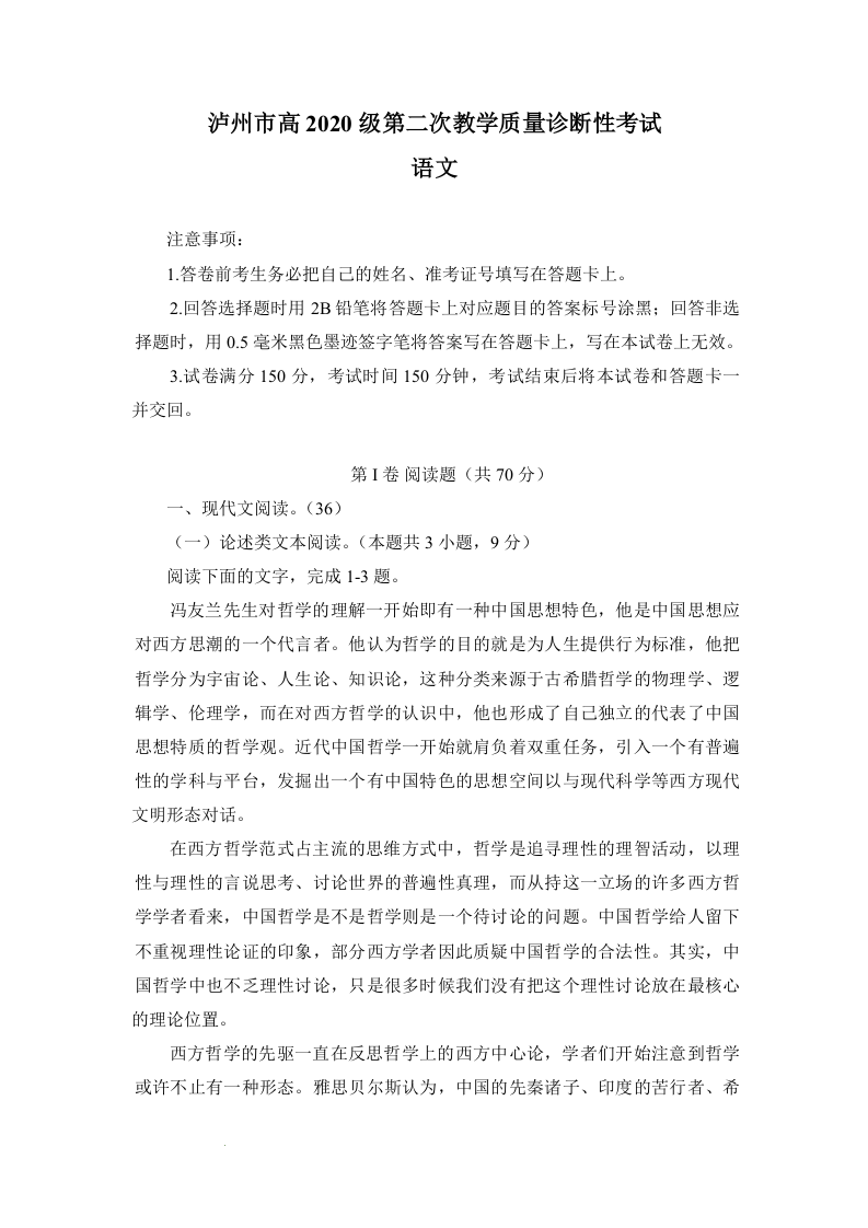 高三语文--四川省泸州市2023届高三第二次教学质量诊断性考
