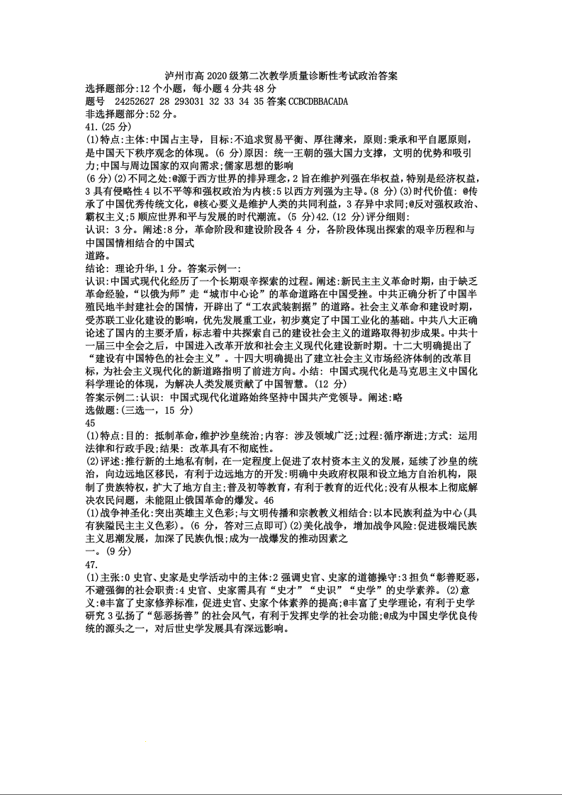 高三文综政治答案--四川省泸州市2023届高三第二次教学质量诊断性考