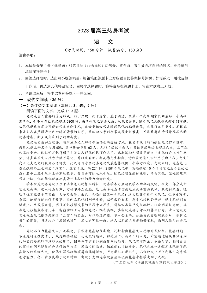 高三语文--四川省成都市第七中学2023届高三下学期热身考试
