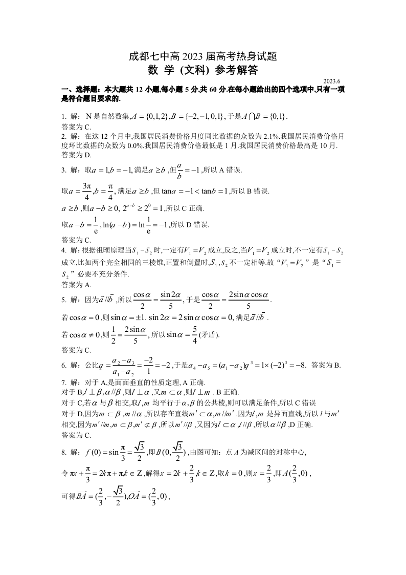 高三文科数学答案--四川省成都市第七中学2023届高三下学期热身考试