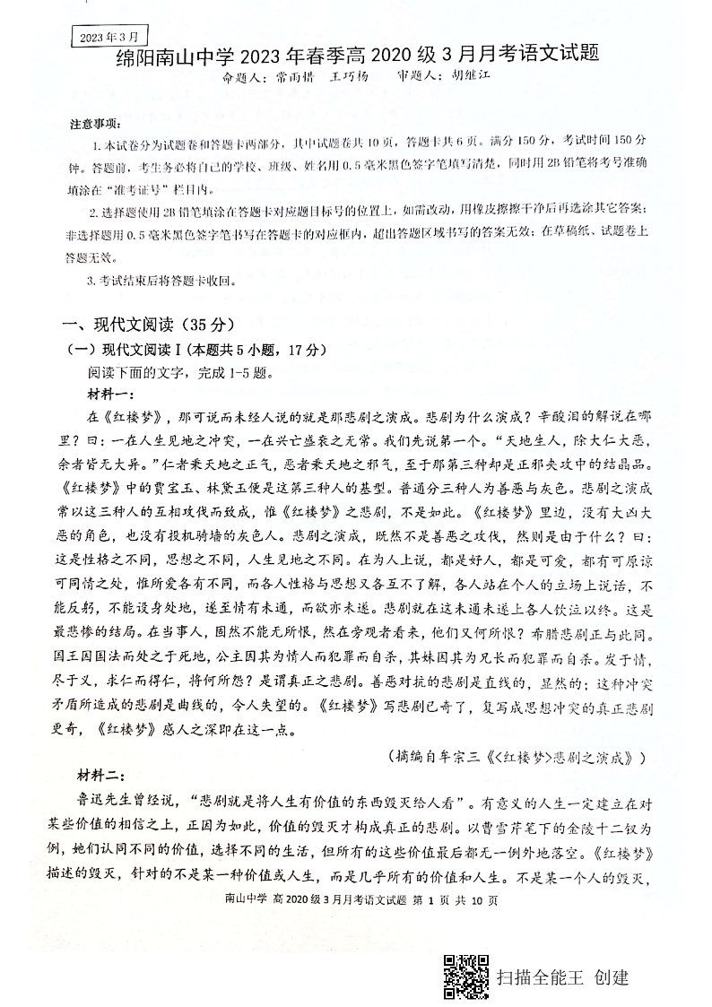 高三语文--四川绵阳南山中学2023届高三下学期3月月考(全科)
