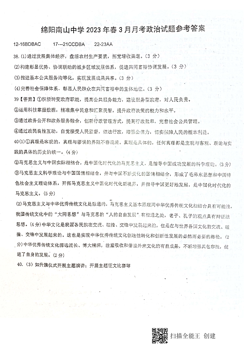 高三文综答案--四川绵阳南山中学2023届高三下学期3月月考(全科)