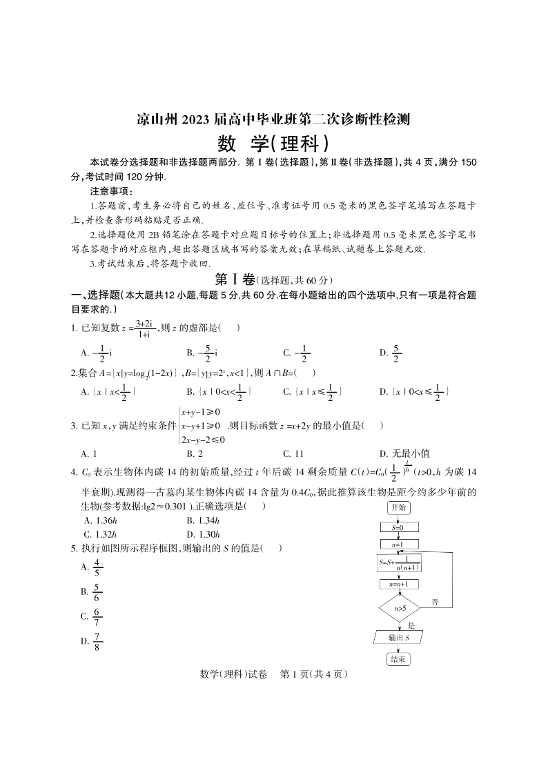 高三理数+答案--四川凉山州 2023 届高中毕业班第二次诊断性检测(凉山二诊)