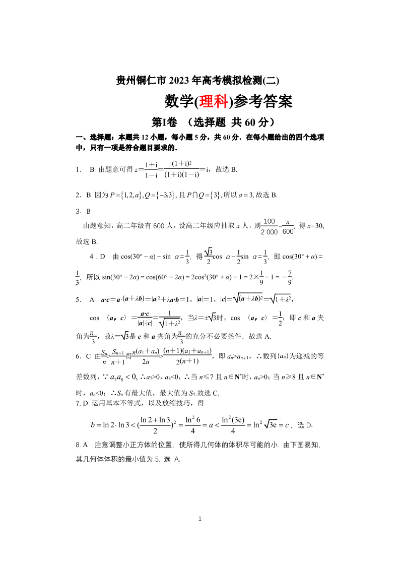 高三理数答案--贵州省铜仁市2023届高三适应性考试(二)