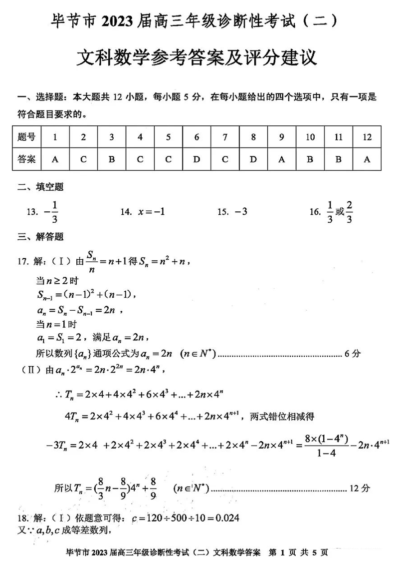 高三文数答案--贵州省毕节市2023届高三诊断性考试(二)