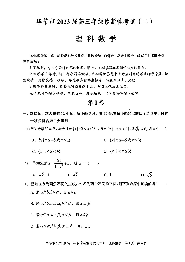 高三理数--贵州省毕节市2023届高三诊断性考试(二)